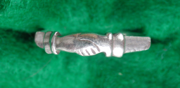 Friendship or Hands Ring This is a copy of an original ring from Fort Niagara. The Hands ring (overlooked by many reenactors) has been found at several 1750-1850 sites around the country. In my area, the sites at Ft. Michilimachinac and the Fletcher Site (Saginaw, Michigan) have several in their collections. Other sites in Western New York, Alabama and Wisconsin also have uncovered many of these rings. |